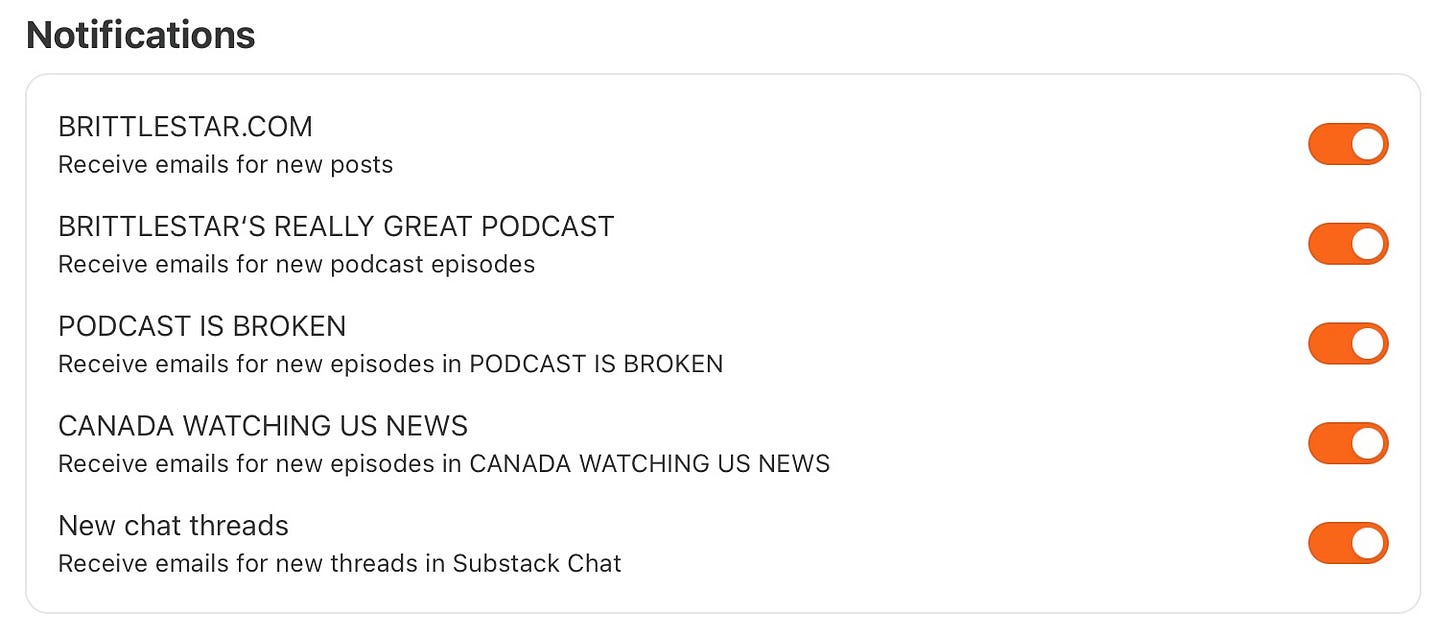 In an effort to keep my head from exploding, we are currently merging all Brittlestar content, Podcast Is Broken, and Canada Watching US News into one subscription.