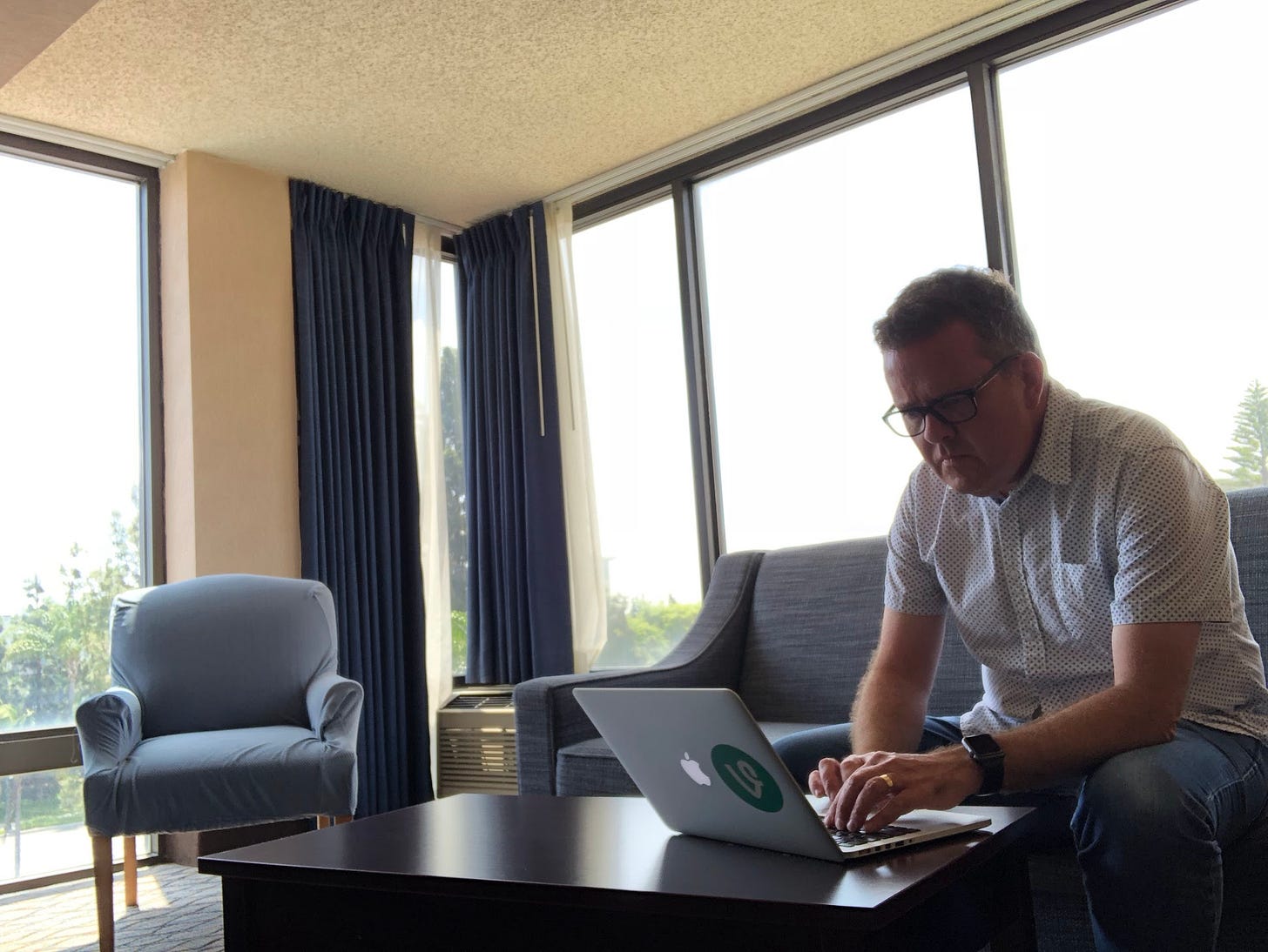 He was watching over my shoulder as I helped him craft his business cards on my screen. I accidentally deleted an element and said, automatically, “Argh… I’m such an idiot.”